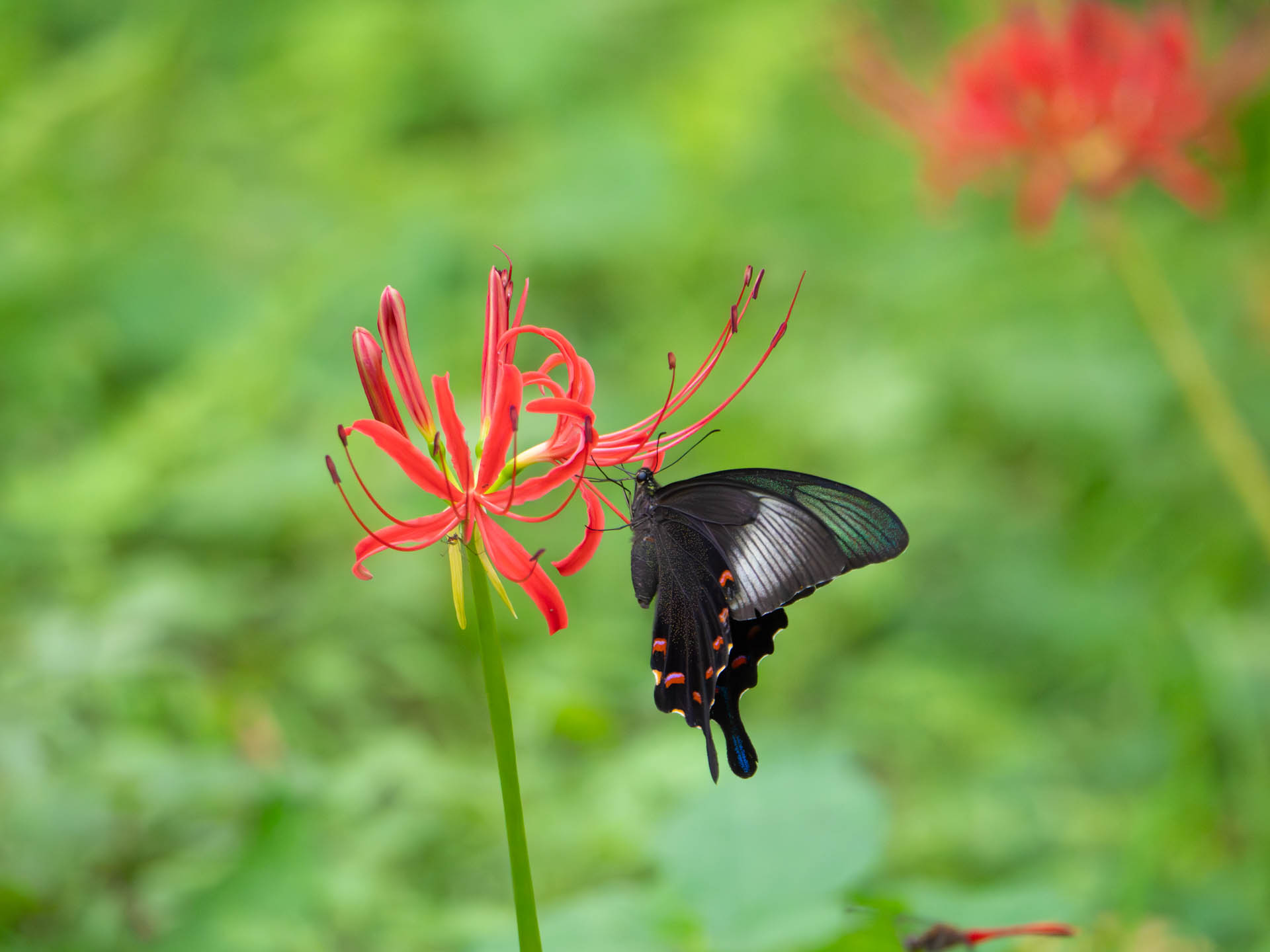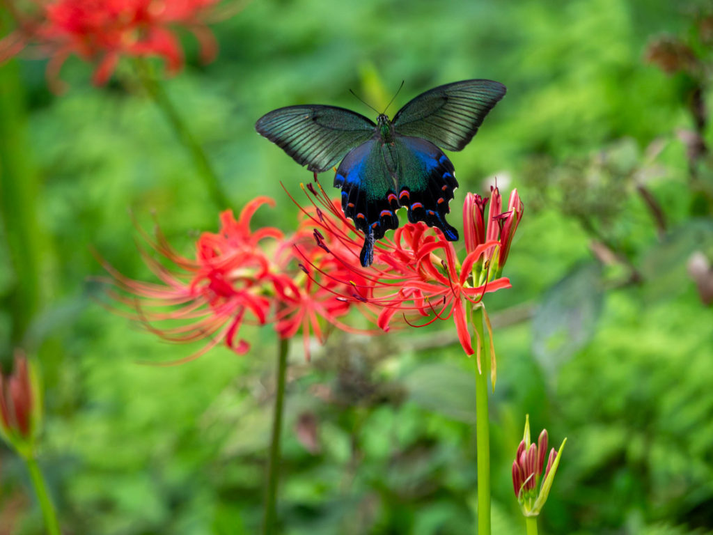 ヒガンバナとミヤマカラスアゲハなど。