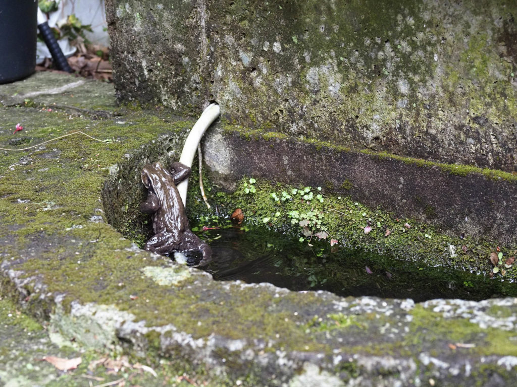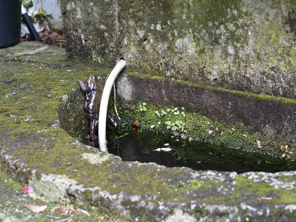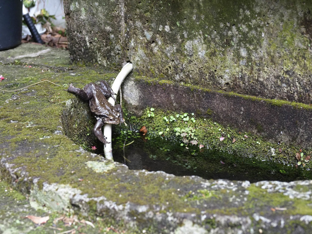 私が外にいるので、犬のタロも出たくて騒いでいましたが、カエルに逃げられたら困るので、そのまま我慢してもらいました。