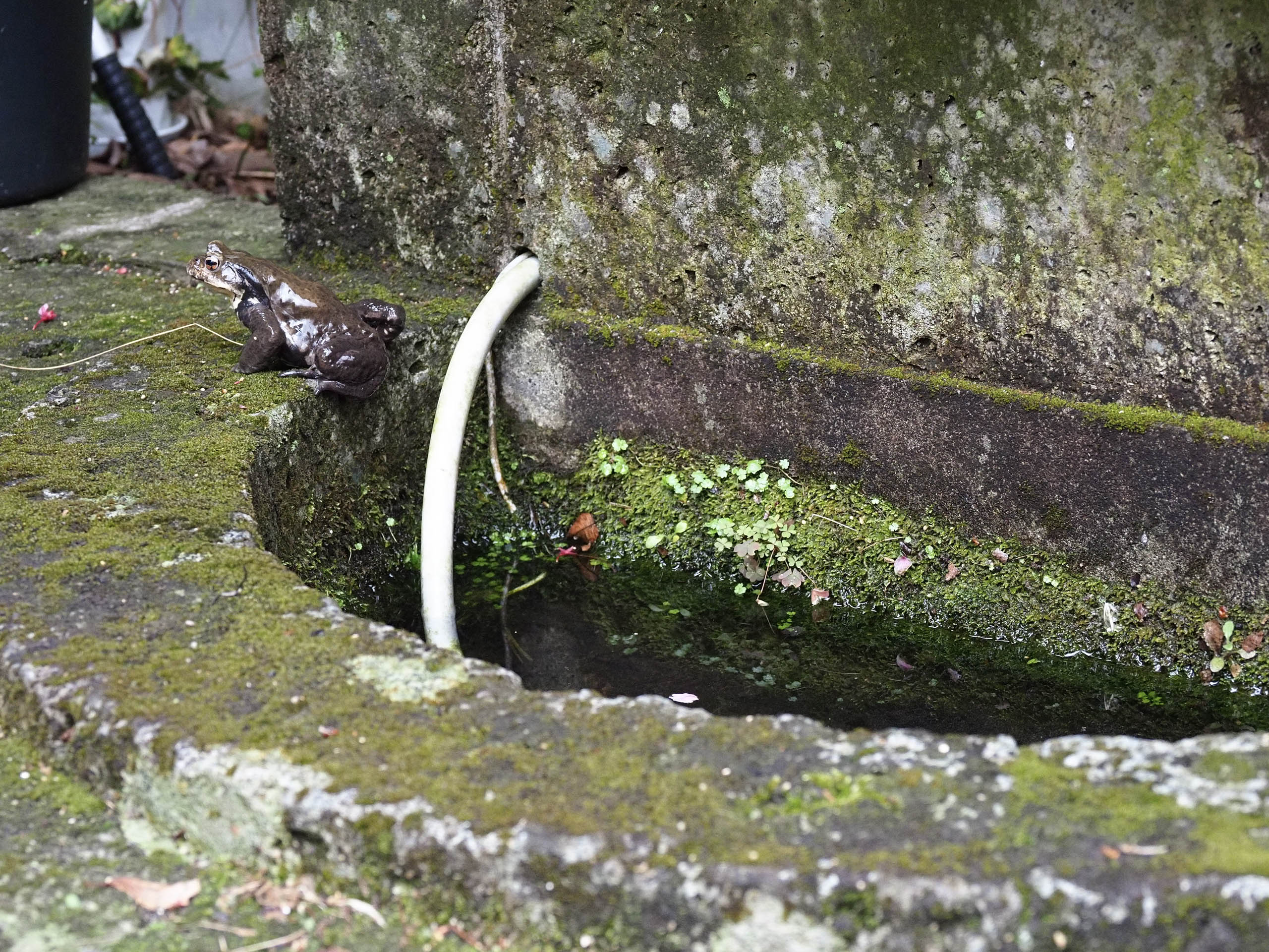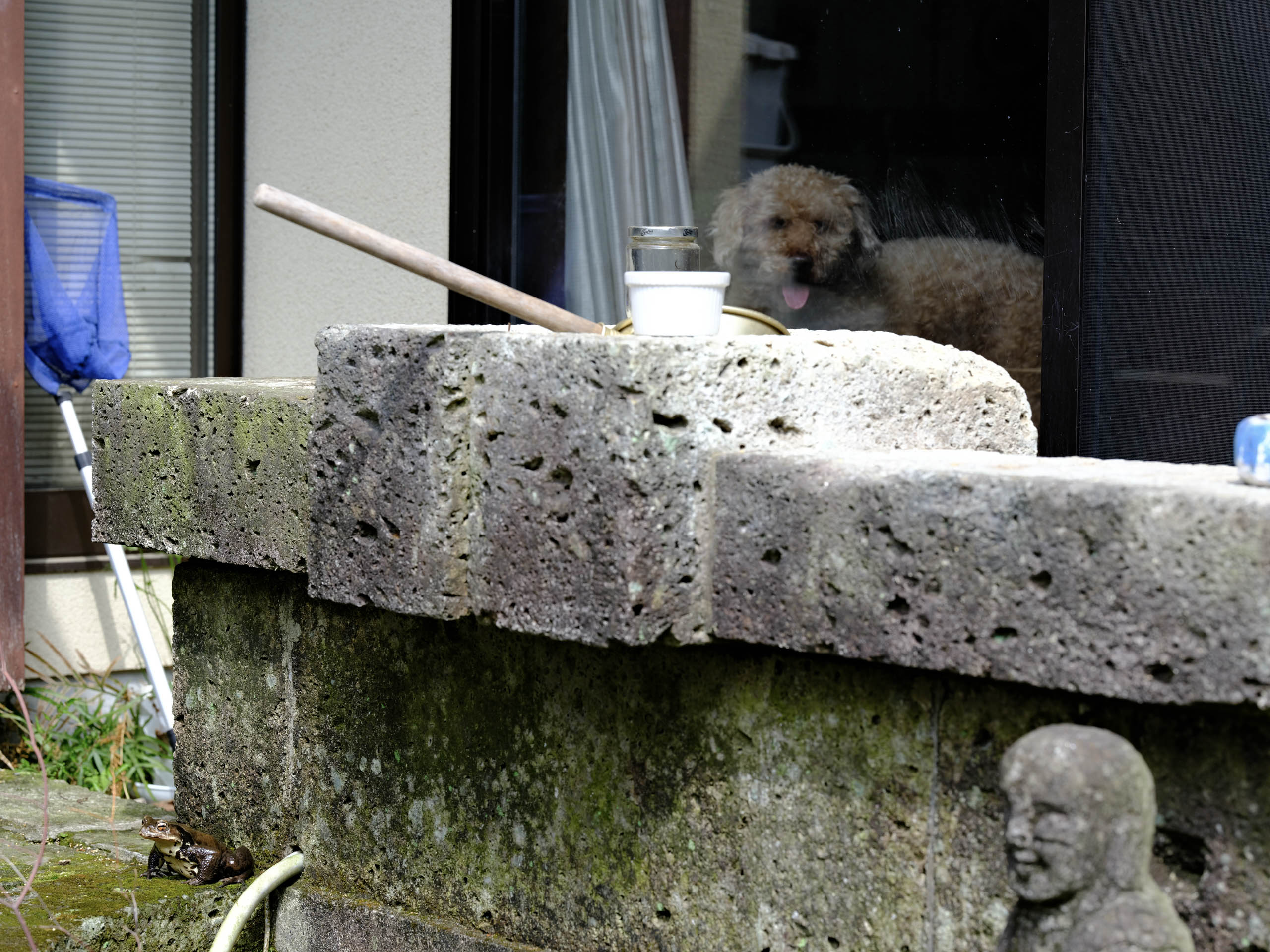私が外にいるので、犬のタロも出たくて騒いでいましたが、カエルに逃げられたら困るので、そのまま我慢してもらいました。