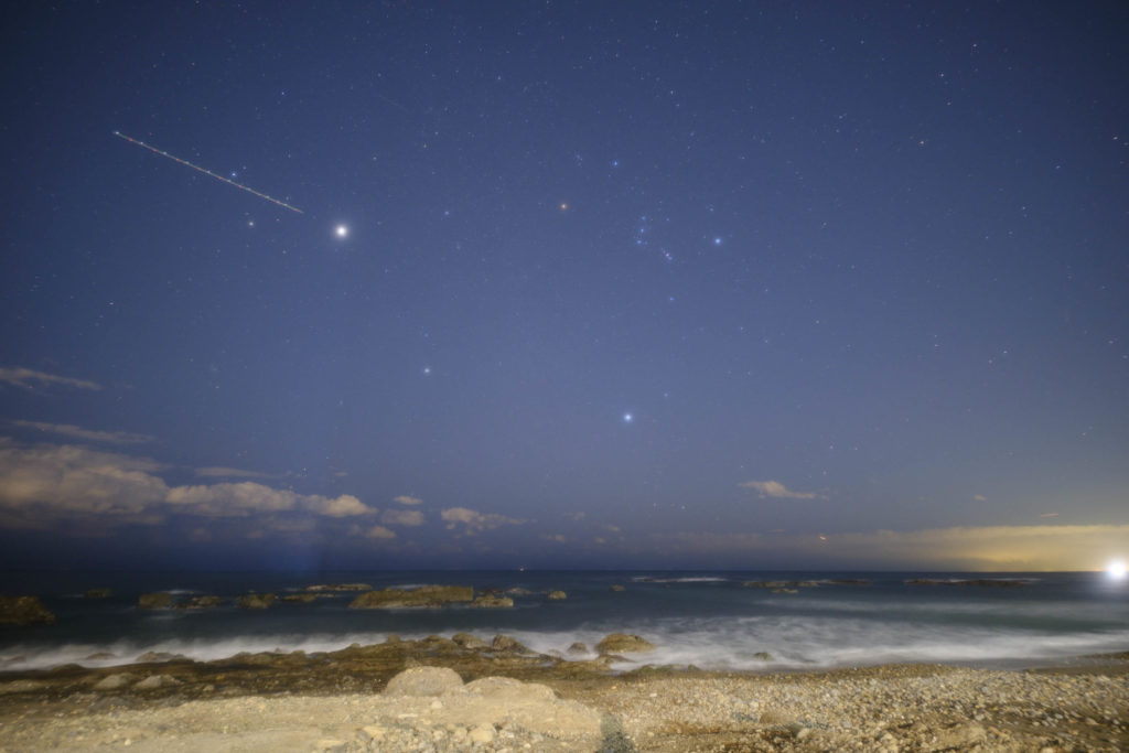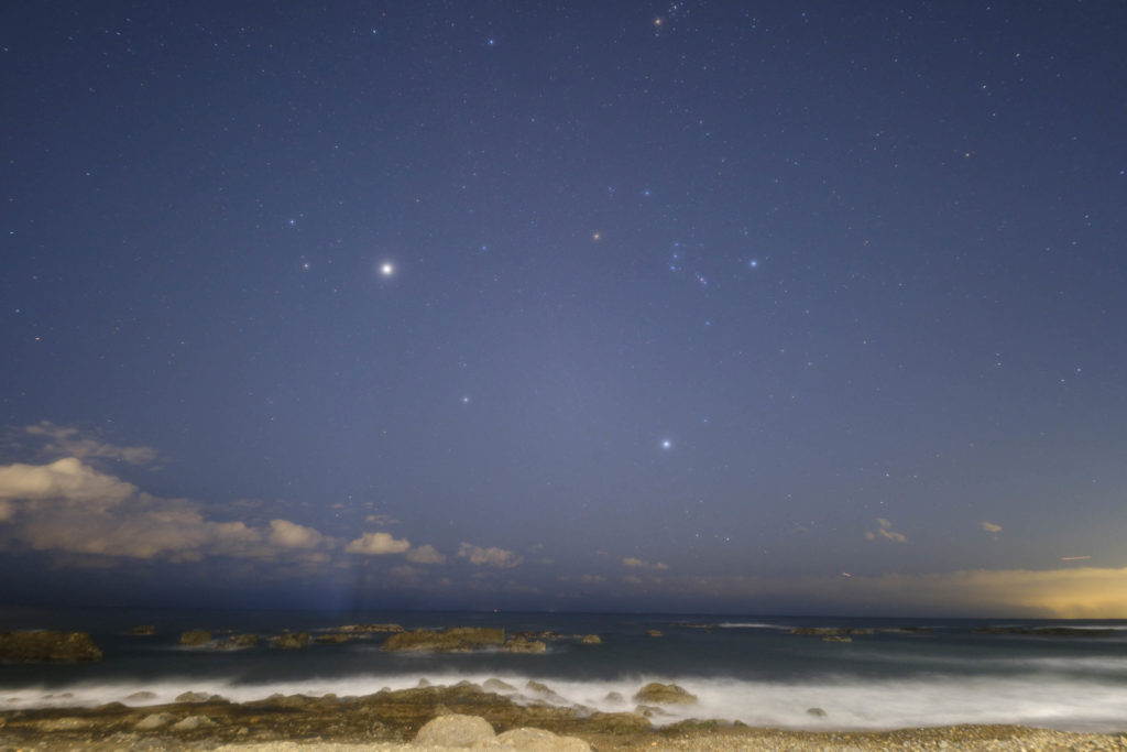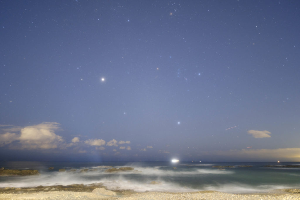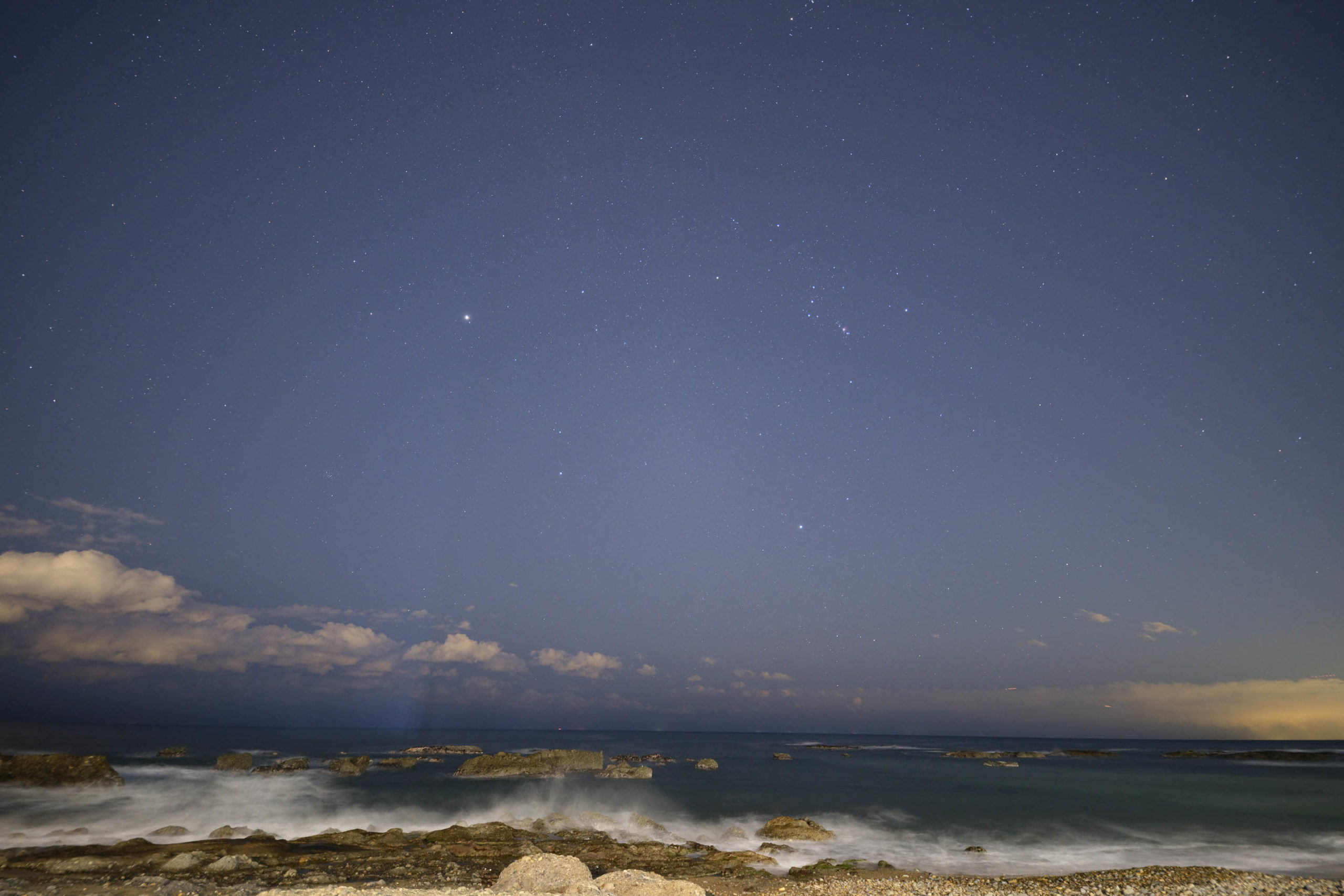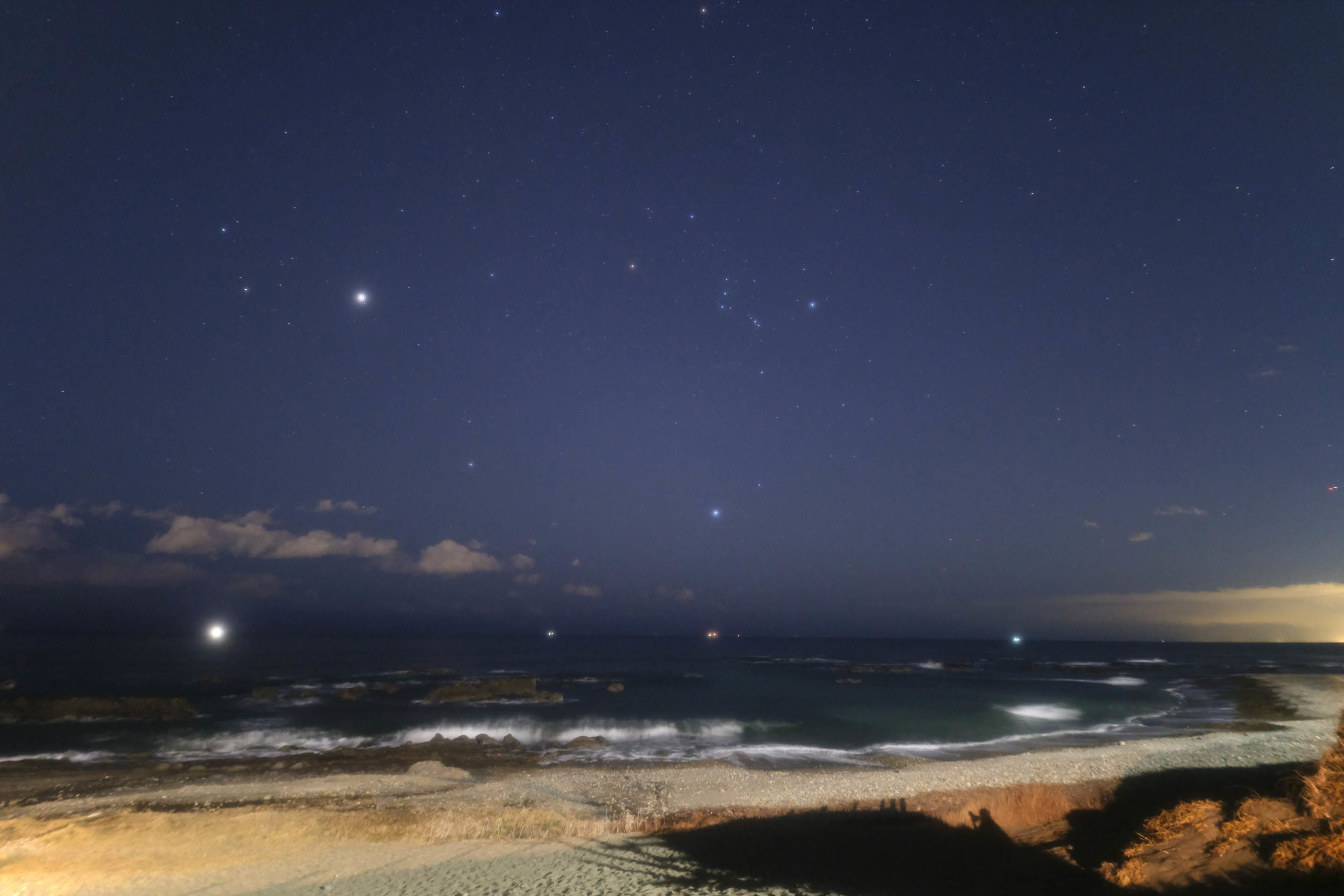 ここから、広角レンズでいろいろ設定を変えて写してみることに。カメラの後方は、海岸を照らす外灯がいくつもあって明るいです。