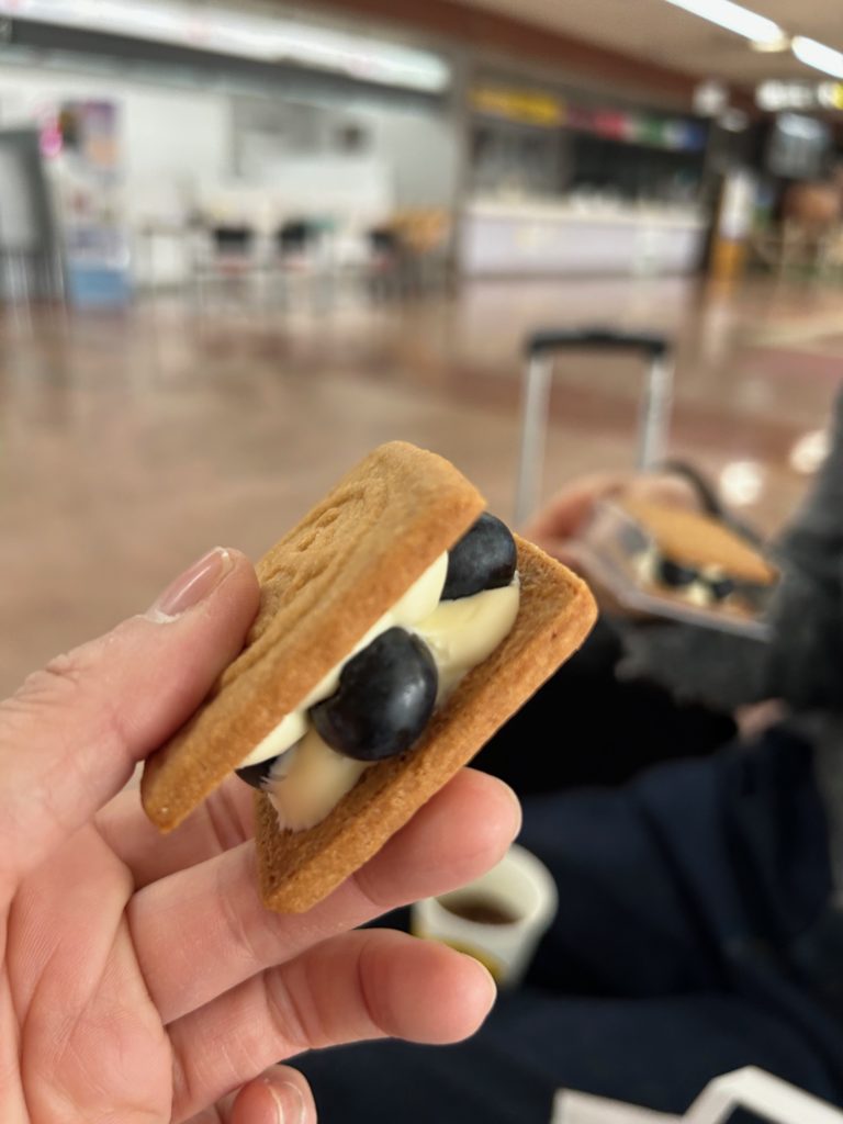 空港に着いて、まずは昨年発売になったという六花亭のブルーベリーのバターサンドがあったので、買ってみました。フレッシュな大きいブルーベリーがたくさん入っていて、風味もよくサクッとして美味しかったです。着いたばかりなのに、帰るときのおみやげが決まりました。