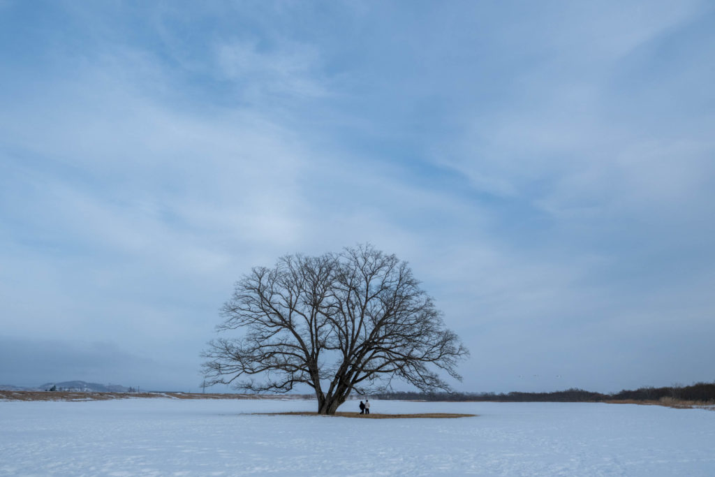 木の下にいる二人は長女と次男、右側にはタンチョウが飛んでいます。合わせたわけでもないのに気づけば、ヒトも鳥も、白と黒。調和していました。